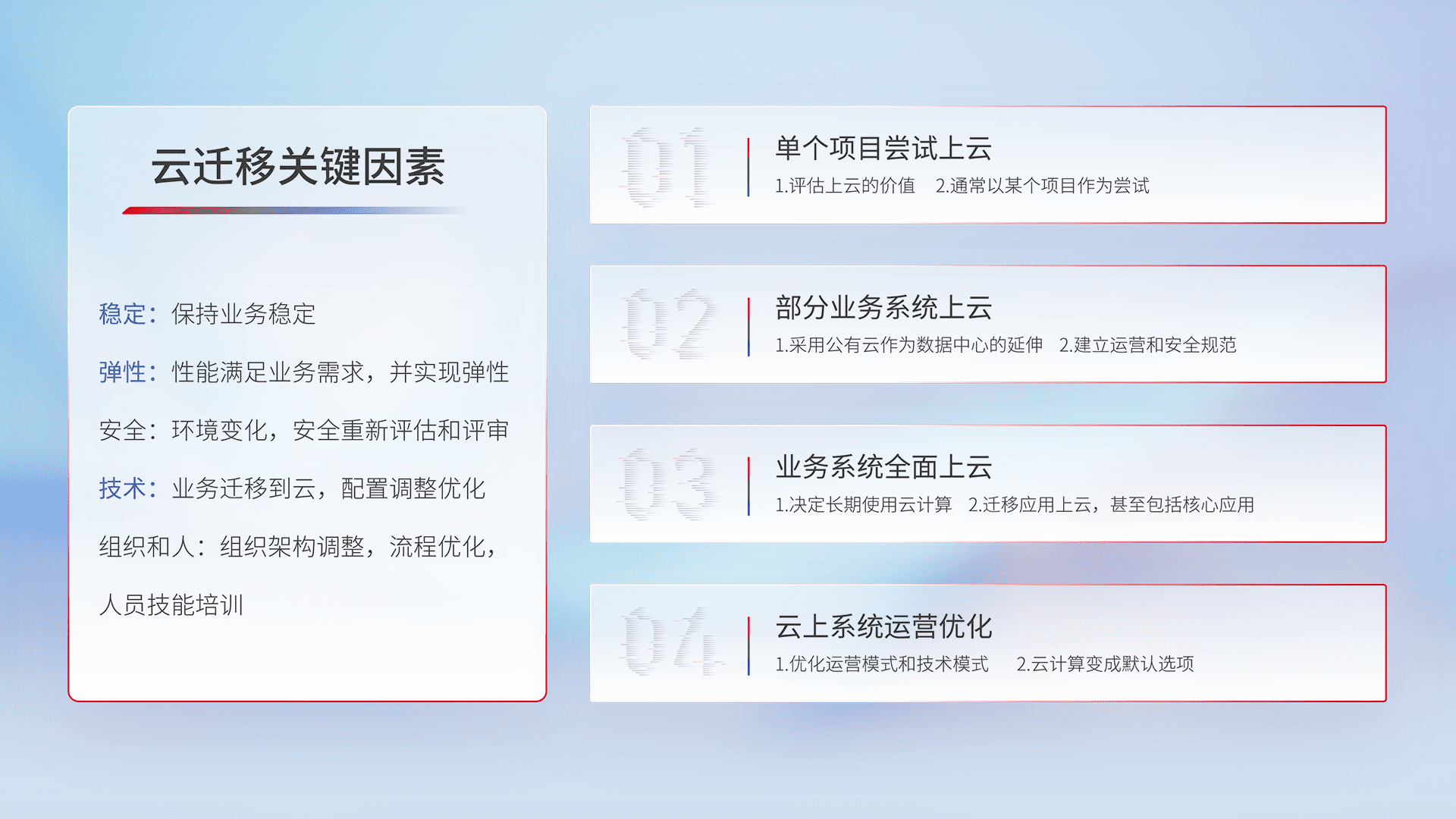 结合实际业务,,从规划设计、、云平台选型、、云原生改造、、、、数据迁移、、、集成交付,,迁移全过程为客户识别最佳上云路径,,,,做好风险识别管理,,,设计网络架构、、、身份权限、、、安全审计合规、、、、操作审计、、日志审计、、、、监控告警策略、、、、多站点容灾设计等,,,对云上基础设施进行整体规划,,,提升IT治理水平,,,,以满足弹性、、高可用、、、、高性能的需求。。。